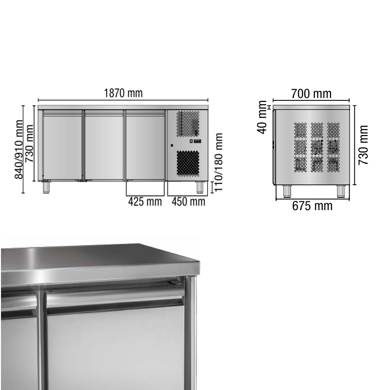 - Dimensions généreuses (LxPxH): 1870x700x840/910 mm, offrant un espace de stockage spacieux pour vos produits.