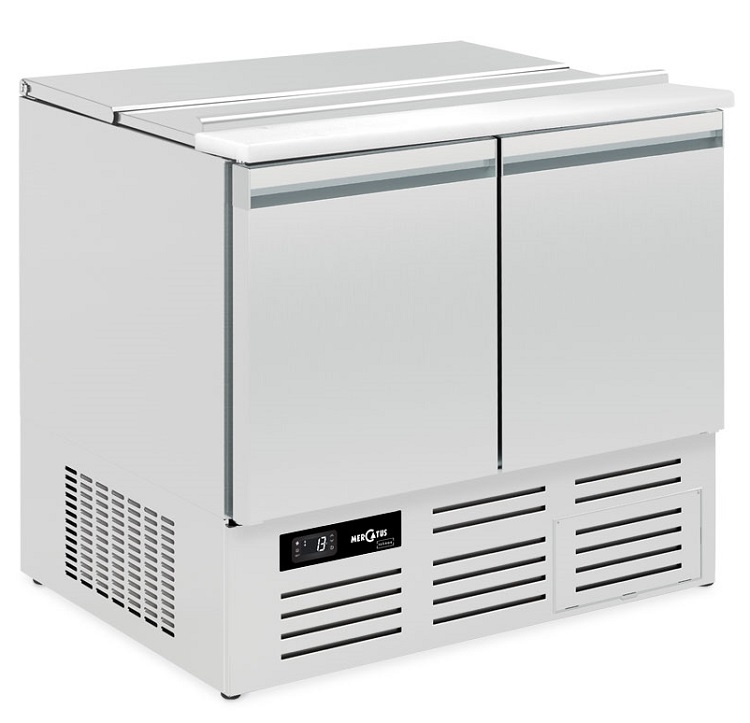 -Le plan de travail comprend une planche à découper en polycarbonate à côté de la cuve réfrigérée, et un plan de travail articulé garantit une parfaite adaptabilité du meuble aux périodes d’utilisation et de non-utilisation.