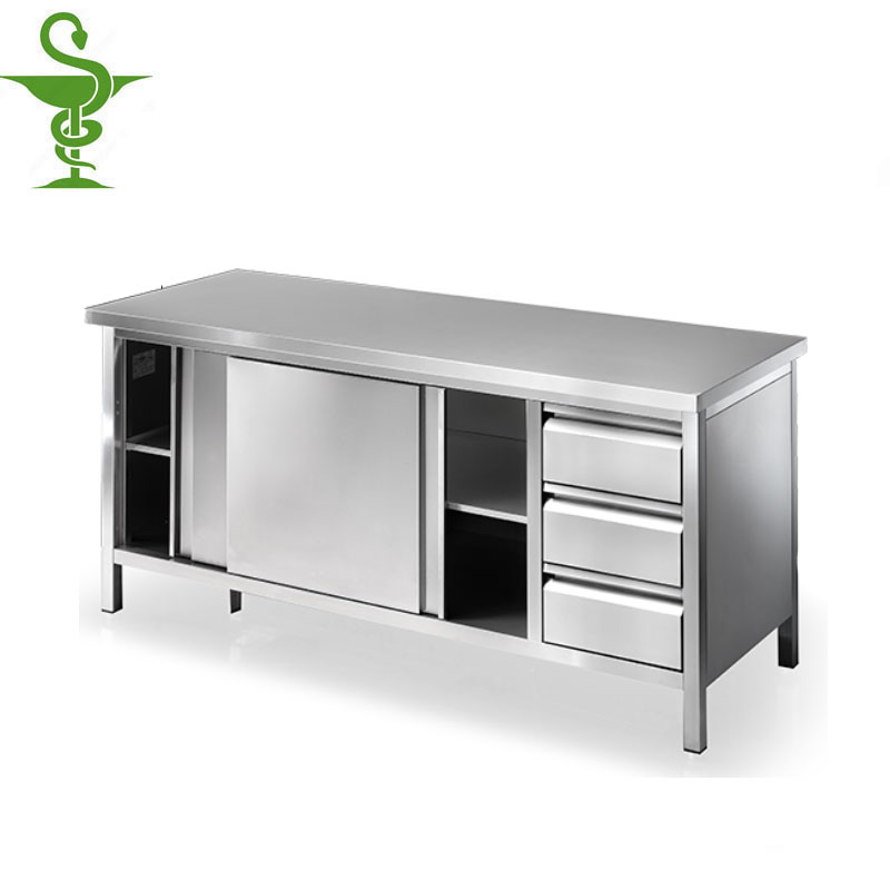Idéale pour les cliniques, hôpitaux et laboratoires, cette table armoire offre un espace de rangement pratique et accessible. Les portes coulissantes permettent de maximiser l'espace de travail en évitant l'encombrement, et les tiroirs intégrés facilitent l'organisation du matériel médical. La surface en acier inoxydable assure une hygiène parfaite et une durabilité accrue.