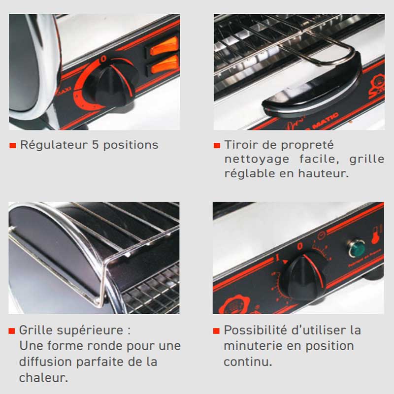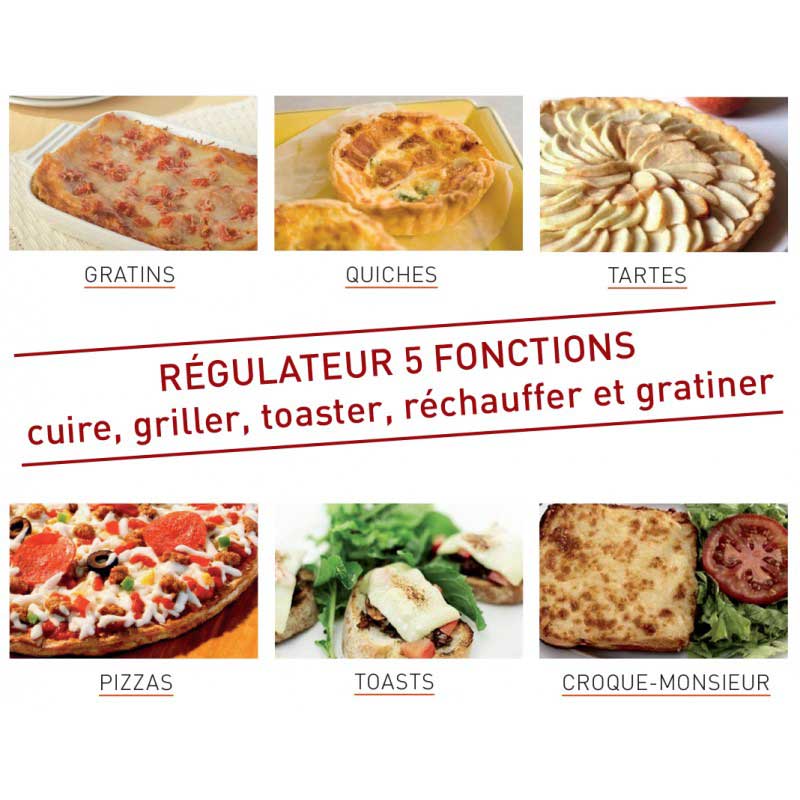 Grâce à son régulateur exclusif, ce toaster permet des usages variés : cuisson d’escargots, tartines garnies, ramequins, bouchées à la reine, gratins, croques, pizzas, tartes tatin.