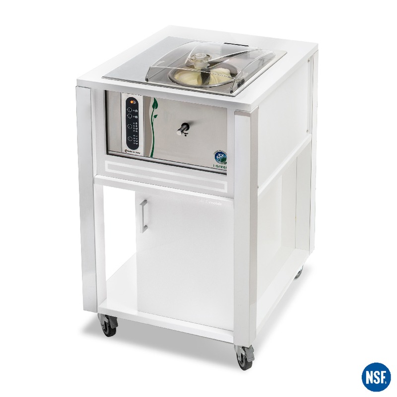 L’environnement vous remercie de l’intérêt que vous portez à nos turbines à glace écologiques de nouvelle génération, fabriquées en Italie par Nemox International. Nous sommes très fièrs de cette nouvelle création qui adopte les meilleures solutions pour l’environnement, réduisant considérablement la consommation d’électricité et améliorant en même temp l’efficacité opérationnelle. Lire la suite Gelato 5k T-Mobile i-Green est la machine à glace qui…suit vos besoins !Cette puissante machine est logée dans en élégant chariot avec finitions et un design raffiné, réalisé en acier peint avec des finitions en acier poli miroir.Le chariot est équipé d’un meuble pour ranger ce qui est nécessaire pour le service.Une intéressante idée pour déplacer la machine où vous le souhaitez, facile à transporter et belle à voir ! Cette série des machines est idéale pour la restauration.Gelato 5k T-Mobile i-green est conçue pour produire environ 1,25kgs de glace en 12/15 minutes, pour une Production horaire : d’environ 5kgs.Le chariot est disponible en blanc ou en noir.Refroidissement à l’air. Cable d’alimentation amovible. En modalité manuelle, le compresseur et la pale fonctionnent en manière indépendante pour donner à l’utilisateur la possibilité d’exploiter son expérience.Le system de conservation peut être actionné seulement si nécessaire.Un dispositif électronique intervient pour arrêter la pale si la consistance de la préparation est trop dure, pour éviter de compromettre le fonctionnement de la machine.Le system de réfrigération continue à fonctionner jusqu’à son arrêt manuel. En modalité automatique, l’utilisateur peut choisir entre 4 programmes de production (glace traditionnelle, glace – glace semi dure, granité, refroidissement rapide) et 4 programmes de conservation pour chaque programme de production.Avec la fonction automatique l’utilisateur ne doit pas penser à rien. Lorsque l’option désirée a été sélectionnée et la machine a été démarrée, la machine s’arrête automatiquement dès que la glace sera prête et se mettra en mode de conservation. Le cœur « Green » souligné du nouveau design, vous permet de travailler en manière écologique, tout en respectant l’environnement. Accessoires inclus :1 spatule enlèvement glace1 set racloires amovibles1 set de joints1 brosse pour le nettoyage Dépliant Fiche technique Catalogue complet