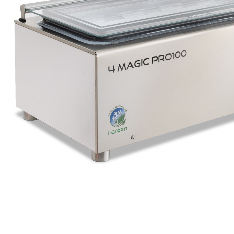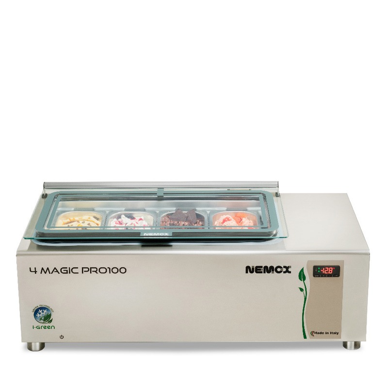 DescriptionL’environnement vous remercie de l’intérêt que vous portez à nos turbines à glace écologiques de nouvelle génération, fabriquées en Italie par Nemox International. Nous sommes très fièrs de cette nouvelle création qui adopte les meilleures solutions pour l’environnement, réduisant considérablement la consommation d’électricité et améliorant en même temp l’efficacité opérationnelle. Lire la suite 4 magic pro 100 i-green est le conservateur de table compacte de Nemox développé pour satisfaire les besoins de qui cherche la qualité, malgré d’espace limité.Le corps est réalisé en acier inoxydable.La conservation de la glace est assurée par une cellule a double paroi parfaitement isolée.Le couvercle, en correspondance de la cellule, est réalisé à double paroi. Un contre-couvercle en techno polymère est couplé au couvercle en verre tempéré, qui crée une cavité isolée d’air.Cette solution technique permet une complète transparence en correspondes des bacs à glace et permet de voir la glace en conservation.La température dans la cellule est gardée constante et homogène grâce au flux d’air créé par un ventilateur.Pour éviter la dispersion du froid, le flux d’air s’arrête lorsque le couvercle est ouvert.Un programmateur électronique permet de sélectionner, entre des valeurs programmables, la température de conservation afin de garder la glace toujours à la bonne consistance pour être servie.La cellule peut accueillir 4 bacs de 2,5l ou 3 bacs de 3,4l et un de 2,5l pour un total de 13l.La température est réglée entre -10°c et -16°c.L’esprit « green », mis en valeur pour le design, permet aux machines i-green de fonctionner de manière écologique, efficaces, économisant d’électricité tout en respectant l’environnement.Cordon amovible.Accessoires inclus :4 bacs 1/4 Gastronorm (h 100 mm de 2,5l) en acier inoxydable 18/10 de production italienne Dépliant Fiche technique Catalogue complet