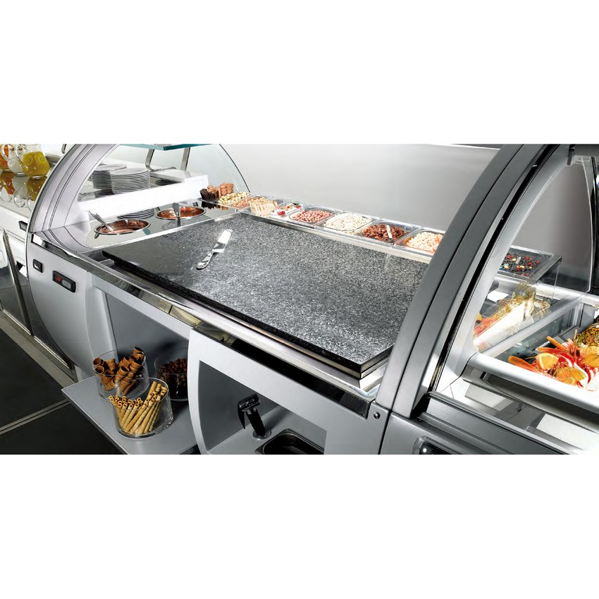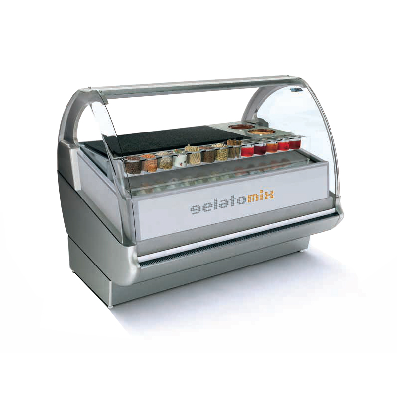Gelatomix est doté d’un plan en acier inox avec plaque réfrigérée en marbre (avec égouttoir sur les contours et pour la collecte et l’évacuation de la condensation), elle est complètement isolée pour garantir la maximum efficacité réfrigérante avec des consommations d’énergie contenues. Côté plaque réfrigérée, on trouve deux récipients cylindriques en acier inox chauffés au bain-marie pour la conservation des sauces, parfaits pour les garnitures chaudes, tandis que la façade orientée vers le public est destinée à accueillir une série de bacs « Gastronorm » destinés à contenir tous les autres types de garnitures (fruits frais, fruits confis, granulés en tout genre, biscuits...). La partie arrière de la vitrine est équipée d’un plan extractible porte-objets et d’un bac de lavage des ustensiles avec douchette pour faciliter le nettoyage de l’espace de travail et garantir une hygiène totale.