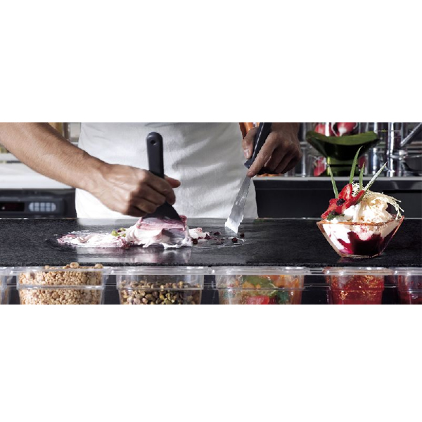 GELATOMIX est le module pour la préparation de la glace à la spatule et la réalisation de coupes ou de plateaux de glace personnalisables. La vitrine d’exposition permet de mettre en scène le moment du service de la glace, le rendant plus attrayant et créant un contact direct entre le vendeur et la clientèle. Servir la glace à la spatule et la préparer en y ajoutant des granulés, fruits, garnitures et sauces, permet de créer une grande quantité de produits en partant d’un nombre limité de produits bases et de personnaliser les créations avec style, goût et créativité.