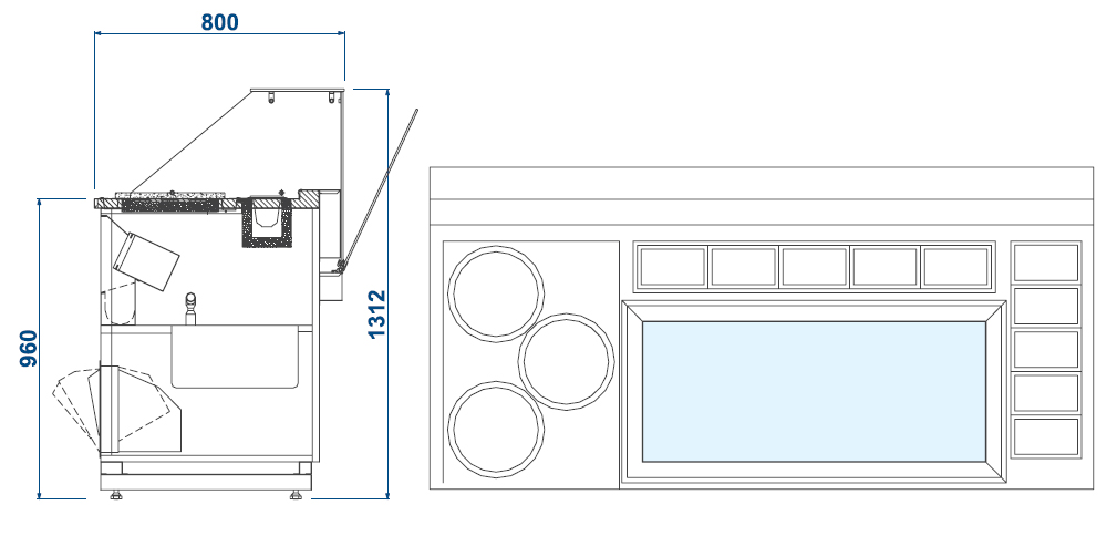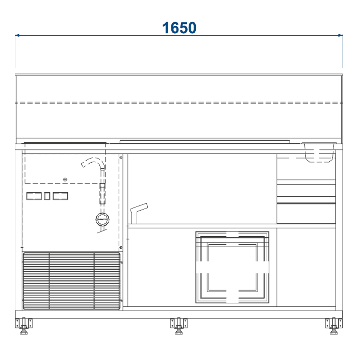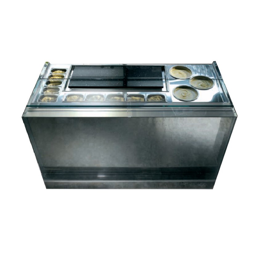 - Sur demande hauteur 1.17 cmBMIX est le comptoir pour la préparation de la glace à la spatule. Ce modèle conçu par ISA est caractérisé par une base en acier au carbone peint avec poussière époxy et par ses pieds réglables. Le reste de BMIX est réalisé en acier inox : l’attention accordée aux matériaux est en effet un des aspects les plus suivi par ISA. Ainsi, le comptoirprésente une structure portante, un plan de service et un panneau côté opérateur en acier inox avec finition brillante. Une serpentine est encastrée dans le plan du canal de contour destiné à la collecte de la condensation, toujours en acier inox, laquelle, par contact, permet de réfrigérer la plaque en marbre.