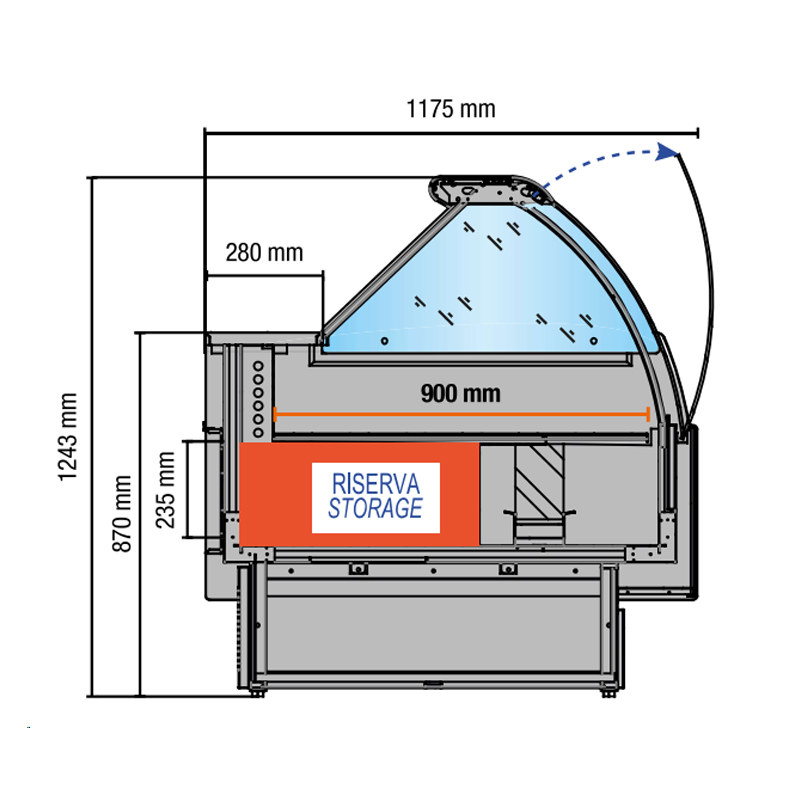 Dimensions : 1520 x 1175 x 1243 mm, une taille généreuse permettant de stocker et exposer plusieurs plats tout en offrant une présentation professionnelle et efficace.