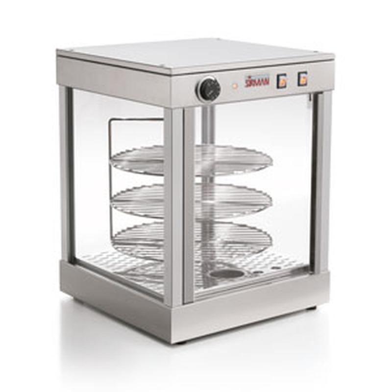 Vitrine pour l’exposition de pizzas, brioches, tartes, feuilletés et amuse-gueule divers, qui maintient une température constante et conserve longtemps la saveur et le moelleux des aliments. - Entièrement fabriquée en acier AISI 403 avec vitres sur les quatre côtés. - Porte avec fermeture soft aimantée. - Thermostat de réglage température. - Tiroir eau pour l’humidification des produits. - Planches tournantes qui favorisent une circulation homogène de la chaleur et une meilleure vision des produits.