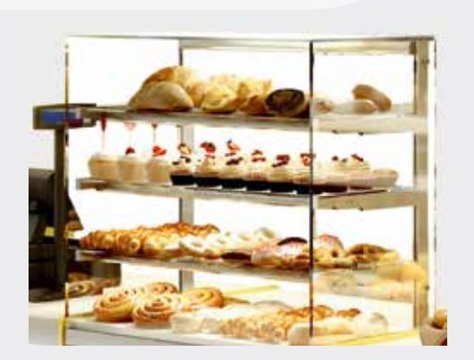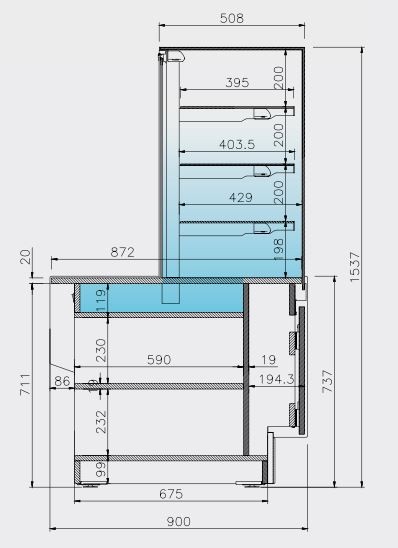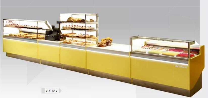Plan de travail en quartz compac blanc. Sécurité frontale plate. Décoration frontale et latérale en laqué DM résistant à l'eau. Décoration frontale d'éclairage LED. Zone d'exposition Eclairage LED. Éclairage à LED. Tablettes en aluminium anodisé.| Gamme | 900 |