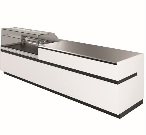 - Réfrigération ventilée - Vitres basses, avec 1 tablette intermédiaire - Exposition EURONORM et GASTRONORM, plateaux amovibles de couleur ANTHRACITE - Joues latérales et fronton en bois, surface mélaminé et chant en ABS,plinthe et la moulure en aluminium BLANCHE (cod. 1) - Tablette de travail en acier inox (cod. X). - Vitres en verre trempé (Extra Clair), vitre frontale à 90° ouvrable et rabattable munie d'un point d'arrêt de sécurité (entretien aisé), vitres latérales avec dispositif antibuée intégré (basse tension 12V), tablette intermédiaire de série. - Cuve d'exposition EURONORM et GASTRONORM en acier inox AISI 304, avec angles et coins arrondis, profondeur 604 mm, fournis de série des plateaux d'exposition amovibles, réalisés en acier inox, traités en couleur - Déflecteur en plexiglas, permettant une distribution homogène de la température - Structure portante tablette(s) intermédiaire(s) en acier inox AISI 304 - Éclairage de type LED (double rangée), avec interrupteur On -Off. - Côté service: portillons en plexiglas coulissants, façonnés, permettant un alignement aux vitres latérales - Groupe compresseur incorporé, classe climatique 3 - Gaz réfrigérant R404a - Évaporateur ventilé, traité contre la corrosion des acides alimentaires. - Dégivrage automatique, avec auto évaporation des condensats. - Châssis réalisé en tôle d'acier plastifié, isolation en polyur éthane sans CFC, pieds en acier inox réglables (coulissants) permettant un parfait ajustement (sur demande: AP = avec dispositif support plateforme 'marche de service' , ou SP = standard sans dispositif). - Appareil construit dans le respect des normes (CE) en vigueur. PLUS : Accouplables pour une configuration flexible (moyennant un kit d 'assemblage). Innombrable possibilité de personnalisation, vitres basses ou vitres hautes, choix des matériaux de la tablette de travail, couleur des joues latérales et du fronton, ainsi que de la plinthe et de la moulure décorative en aluminium (avec en option la possibilité d'y intégrer un éclairage LED), couleur des plateaux d'exposition (anthracite, blanc ou acier inox). Évaporateur traité, dispositif d'auto évaporation des condensats, lumière LED, système antibuée intégré...... Sur demande: Él éments neutres ou caisse, éléments angulaires 90° et 45°, aussi bien ouverts que fermés, disponibles aussi en version brute (sans panneau décoratif frontal, sans joues, plinthes ....) ADVANTAGE: Mettez en valeur vos desserts, gâteaux, macarons... mais aussi salades, sandwiches, yaourts, boissons. Grâce à leur grande surface d'exposition EURONORM et GASTRONORM et leur éclairage LED, un design très épuré MADE IN ITALY, le soin du détail ainsi qu'une finition irréprochable des comptoirs vitrines Metrika sauront contenter les plus exigeants. Metrika Line vous offre un programme complet d'éléments personnalisables pour satisfaire à toutes les exigences spécifiques de vos agencements 'food &; bar'.