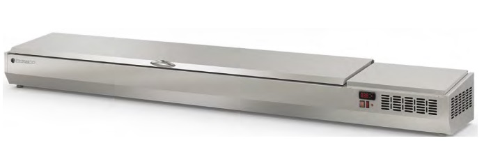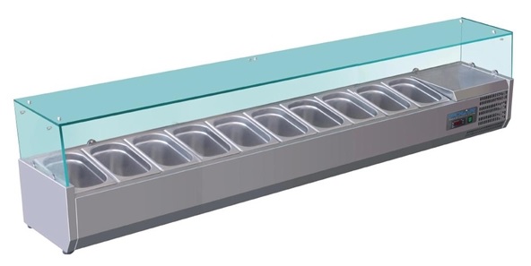 la Vitrine réfrigérée 10 bacs est innovante et polyvalente grâce à son pourtour en verre et sa capacité allant jusqu'à 10 bacs GN 1/3 .