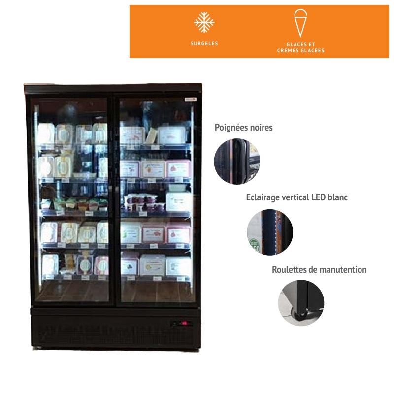 - Panneaux Intérieurs et Étagères Noirs pour un Look Élégant : Les panneaux et étagères noirs apportent une touche de modernité à votre espace de vente. Ce design soigné met en valeur vos produits surgelés tout en attirant l'attention des clients.