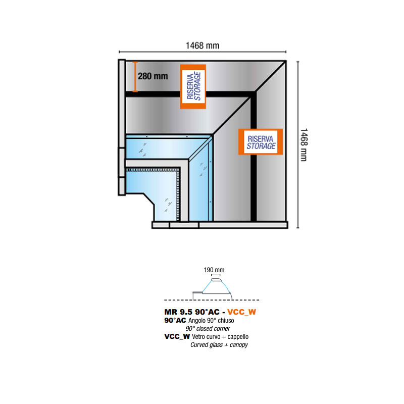 Vitrine d'angle professionnelle non réfrigérée avec coin fermé à 90°, combinant espace d'exposition et zone de stockage. Ce modèle Tecnodom est équipé d'un espace de rangement de 100 litres avec deux portes d'accès, idéal pour les commerces nécessitant une solution complète d'exposition et de stockage.