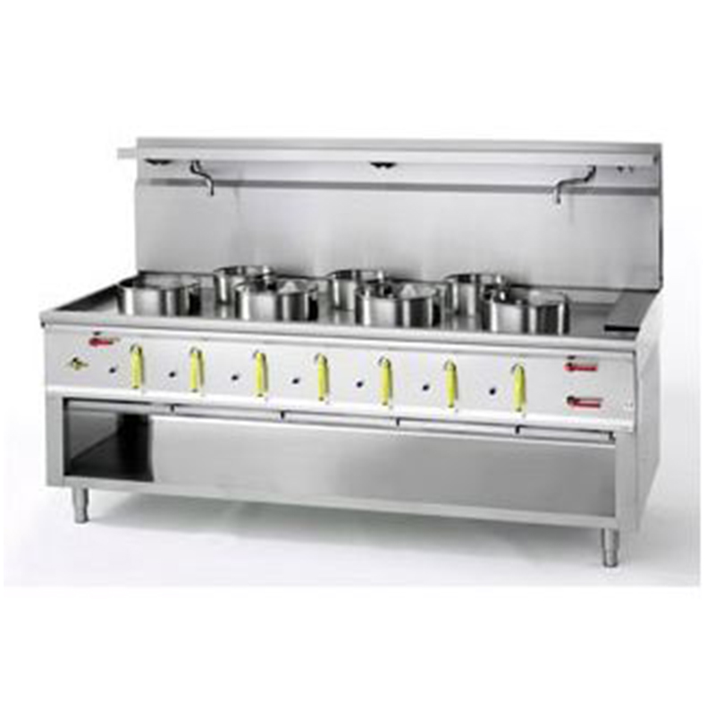 - Le plan de cuisson, embouti et étanche, est muni de brûleurs WOK avec couronnes amovibles, Ø290mm et Ø230mm, plusieurs combinaisons de brûleurs sont disponibles selon les besoins de l'utilisateur.